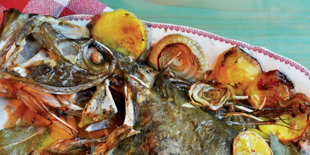 Clean and drain the john dory fillet. Cut the onions into rings and place them into the oven tray covered with a film of olive oil. Peel the potatoes and slice them into discs as thinly as possible, place them on top of the onions. Put the fish on top of the bed of vegetables. Sprinkle some ground black pepper and salt on top. Put some lemon slices and bay leaf on top of the fish. Place potato discs on the fish. Put garlic cloves into the tray, making sure they do not touch the fish, and pour some melted butter over the fish. Bake for 20 minutes in the oven preheated to 200°C. Serve with fresh mint on top.