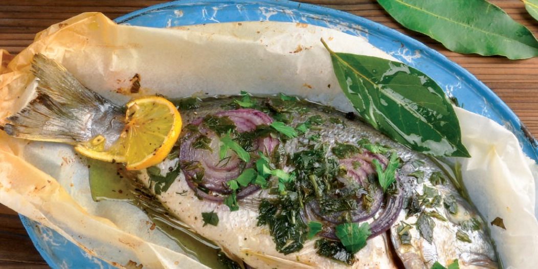 Clean the sea bream and cut the baking paper properly. Then place the bream onto the baking paper and add some salt and black pepper. Put thinly sliced onions and some parsley inside and on top of the fish. To add flavor, put a few thin lemon slices inside the fish. Pour two spoons of olive oil over the fish evenly and add bay leaf and a few lemon slices on top. Fold the baking paper, making sure it is fully closed. Bake for 20 minutes in the oven preheated to 200°C.