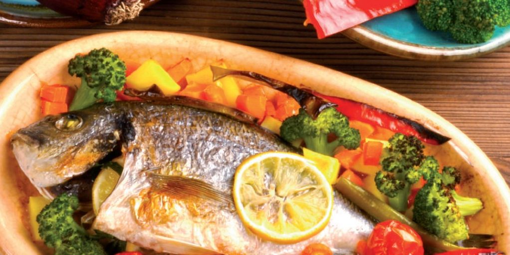 Cut the onions into rings and place them in an oven tray covered with a film of two spoons of olive oil. Scale and gut the sea breams and fill them with a pinch of parsley and two pieces of sliced lemon, and lay them on top of the onions.