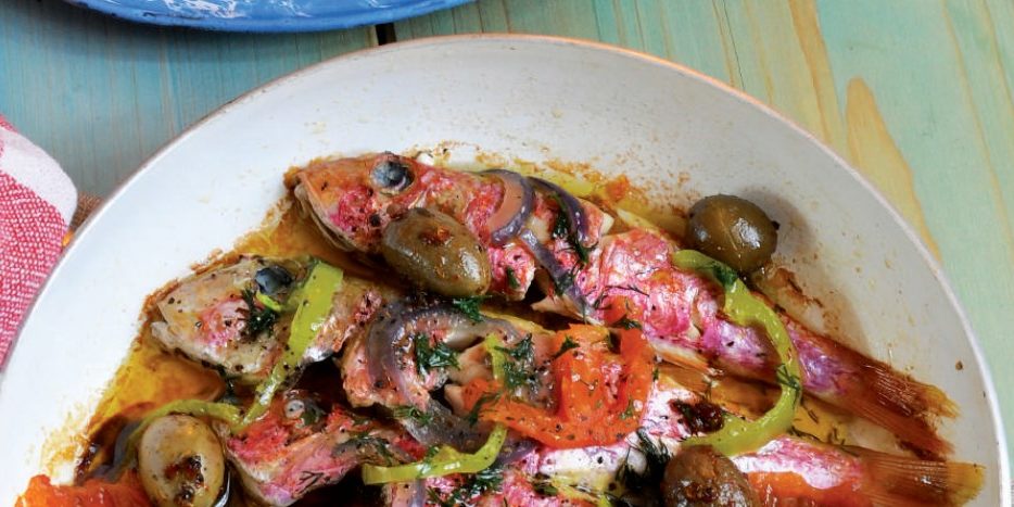 Clean the red mullets and place them into a pan coated with a small amount of olive oil. Peel and finely chop the tomatoes. Slice the peppers in half and chop finely. Peel, deseed and thinly slice the lemon. Lay the peppers, lemon, onions, bay leaves, tomatoes, rosemary, dill and olives on top of the red mullets. Sprinkle salt and black pepper to taste. Fry for 10 minutes at a low heat until ready to serve.